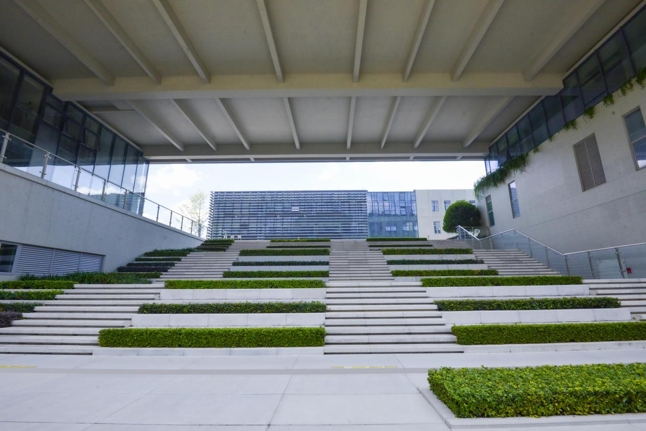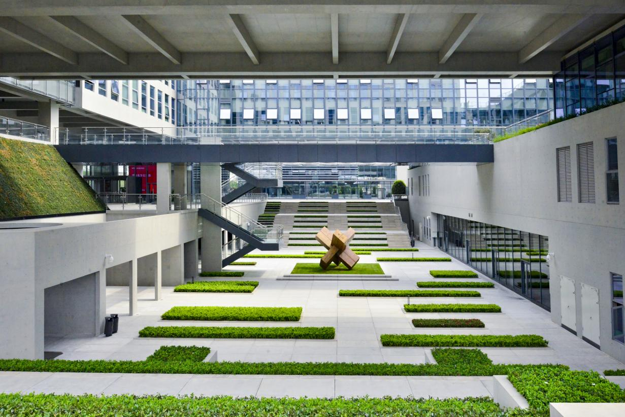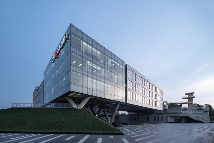 设计融合“花园式办公”和“建筑博物馆”理念,采用清水混凝土、钢结构、原木榫卯与建筑工业化相结合的多元组合,工程大量采用大跨度空间结构,应用V形柱与型钢混凝土空腹桁架体系,形成一座“悬浮于绿丘之上的立方体”。