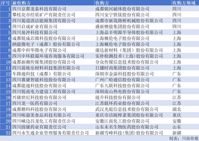值得关注的是,在被并购的企业中,如成都新潮传媒集团股份有限公司、成都中科华微电子有限公司、成都楷码科技股份有限公司、四川峨边昌龙化工有限责任公司、攀枝花市经质矿产有限责任公司、兴储世纪科技股份有限公司、成都能通科技股份有限公司、四川蜀道清洁能源集团有限公司、四川京都龙泰科技有限公司、四川龙一医药有限公司、四川味滋美食品科技有限公司、四川固康药业有限责任公司、四川启成矿业有限公司等,横跨科技、能源、消费、医药等多个领域,均是川商传媒的持续关注与深度报道对象。川商传媒始终致力于对四川本土优质企业价值的前瞻性发掘与深度覆盖,切实助推四川经济高质量发展。