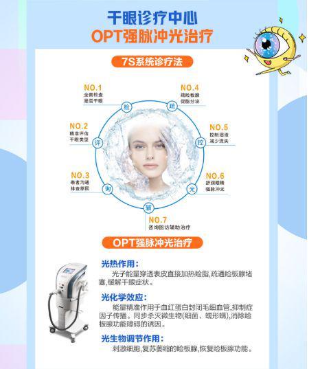 OPT强脉冲光治疗作为目前临床干眼治疗重要方式之一,OPT强脉冲光治疗通过强光照射封闭眼睑周围异常毛细血管,消除引发睑板腺功能障碍炎症因子和蠕形螨,降低睑缘细菌载量。同时通过强脉冲光作用于眼睑周围,封闭周围扩张的血管,此外通过脉冲光热传导加热睑板腺,疏通堵塞的睑板腺。脉冲光产生的热量可熔解软化睑酯,疏通睑板腺,提升眼内“油”的质量,从病因上解决干眼。