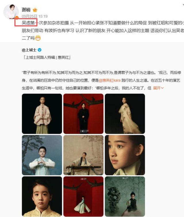9月25号那天,谢楠在微博上发了一组杂志照片,配文“第一次和大家见面,我的小男子汉吴虑”——这是吴京的二儿子,6岁的吴虑,第一次正式出现在公众面前。