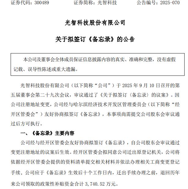 光智科技(300489)的股东一觉醒来发现,上市公司有了大动作!光智科技9月10日晚间连发两则公告:一是拟把注册地从哈尔滨迁至浙江衢州;二是因“出走”,需向哈尔滨经开区管委会退还历年政策性补贴3,740.52万元,相应冲减2025年利润2,759万元。