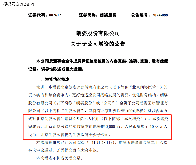 2024年11月28日,朗姿股份对外发布增资公告,公司通过全资子公司朗姿医疗对旗下北京朗姿医疗管理现金增资9.5亿元,实收资本由5000万元增至10亿元。据悉,朗姿股份此次增资的主要目的是为通过北京朗姿医管继续推进收购医美机构的计划,因此需要增强北京朗姿医管的资金实力。